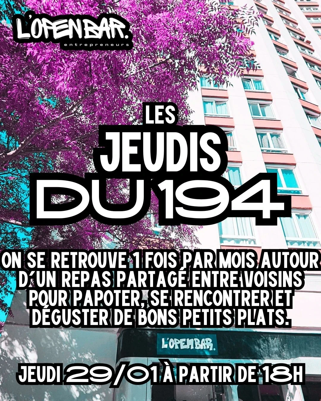 C'est parti pour le nouvel événement incontournable du 194 rue d'Alésia. Un jeudi par mois de 19h à 22h on se retrouve autour d'un repas partagé (salé, sucré, boisson, chacun amène ce qu'il peut) pour faire connaissance, passer un bon moment entre voisins et se retrouver !