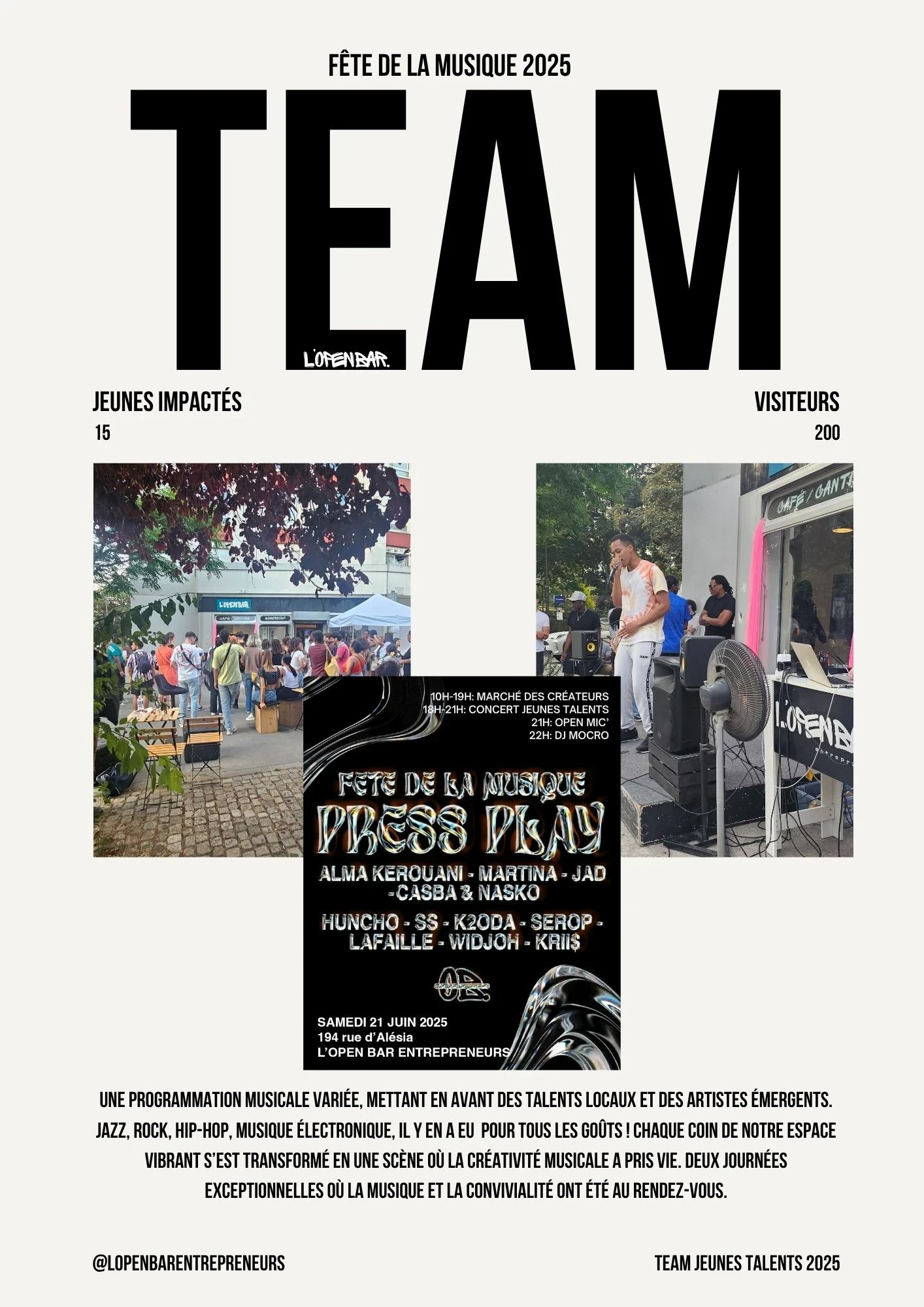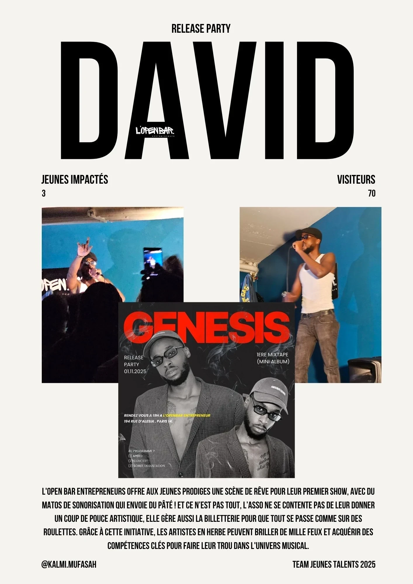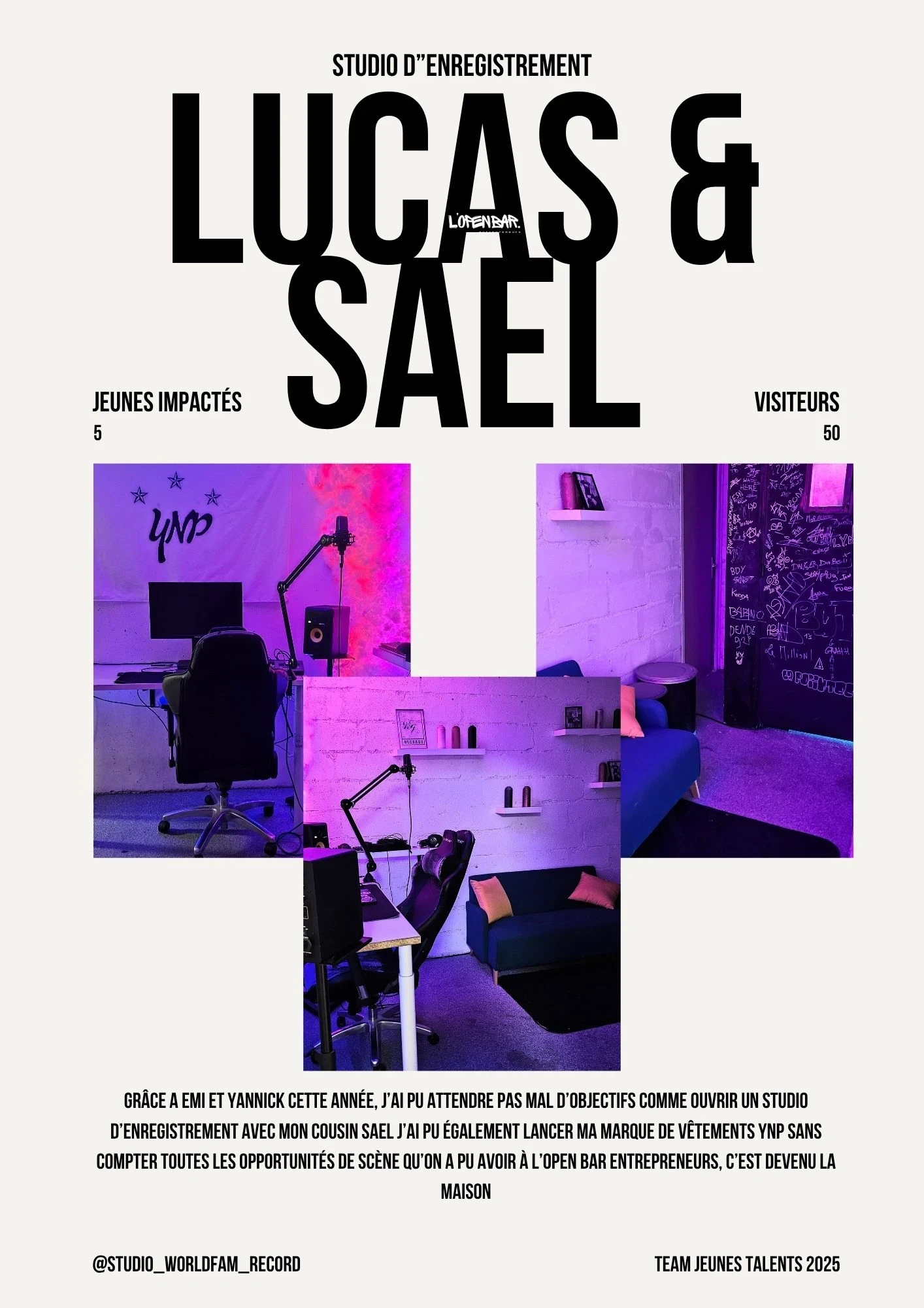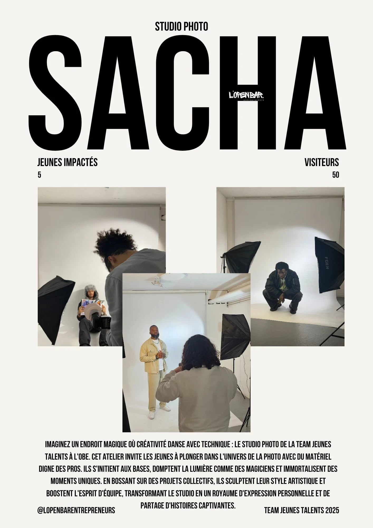 Que vous soyez photographe, chanteur, musicien ou artiste en tout genre et que vous avez -25ans, l'Open Bar Entrepreneurs est votre scène, votre atelier, votre laboratoire d'idées.