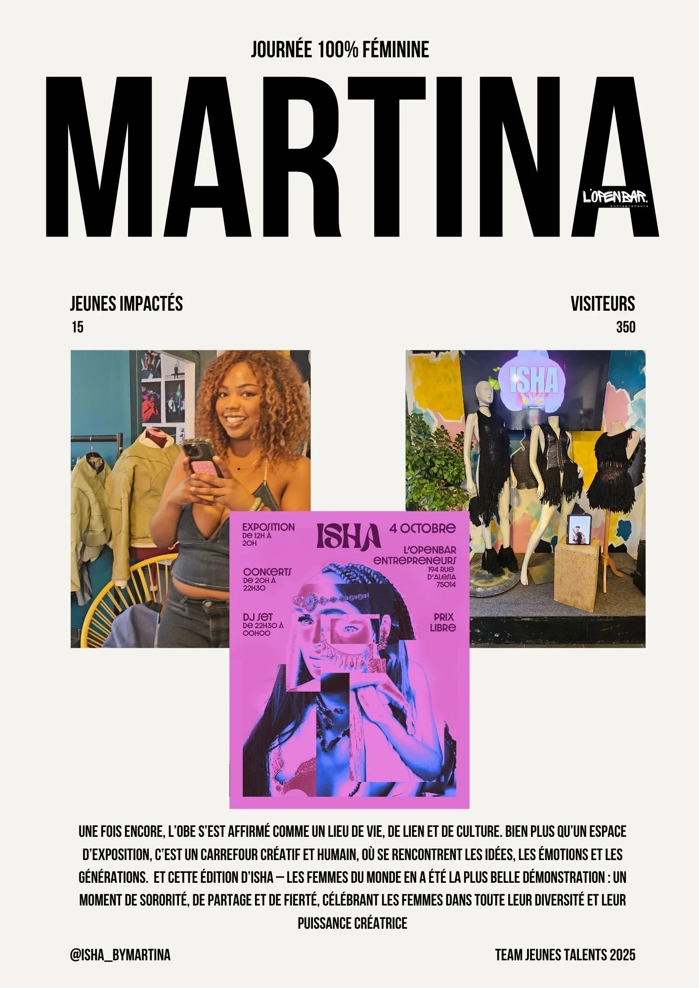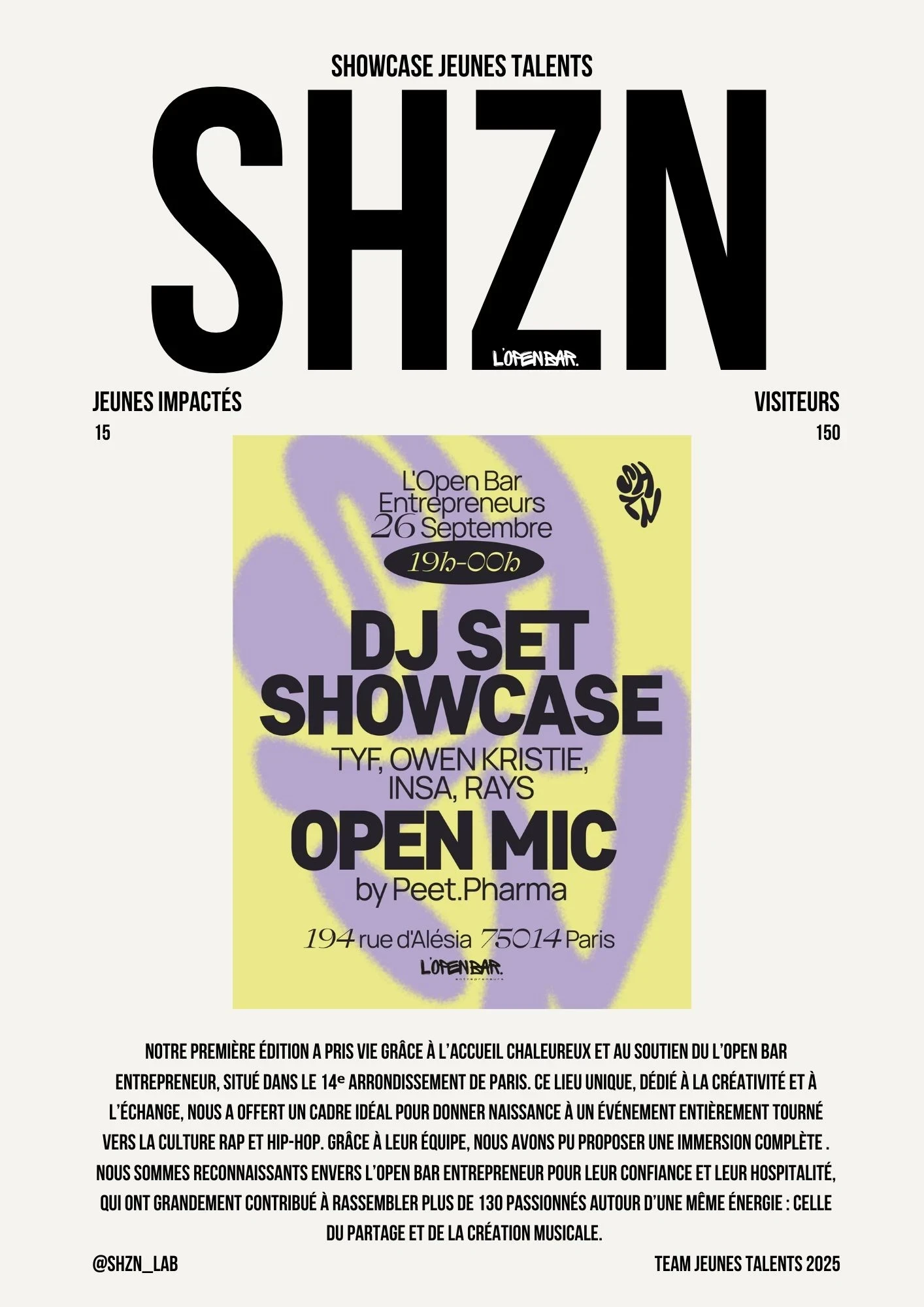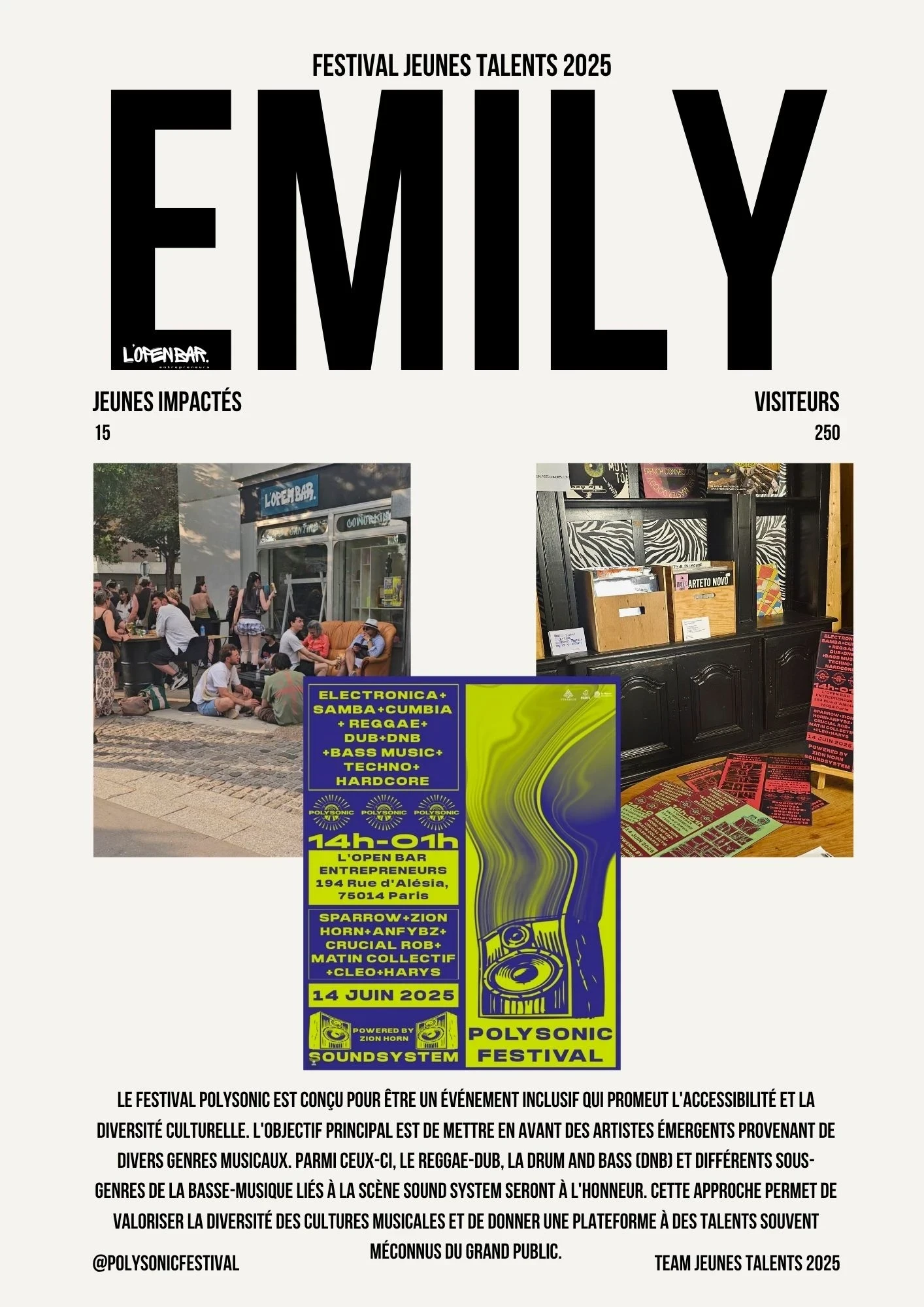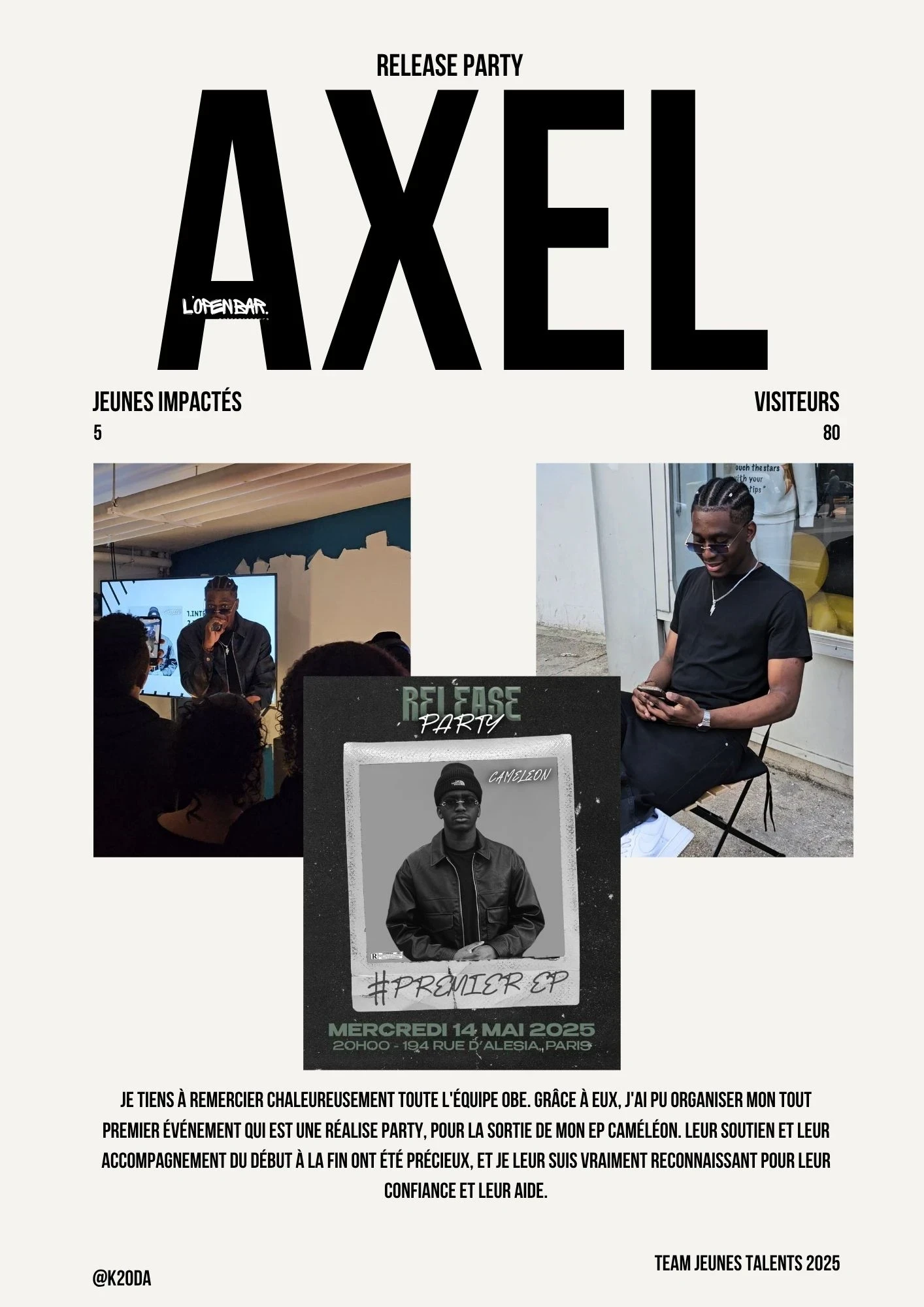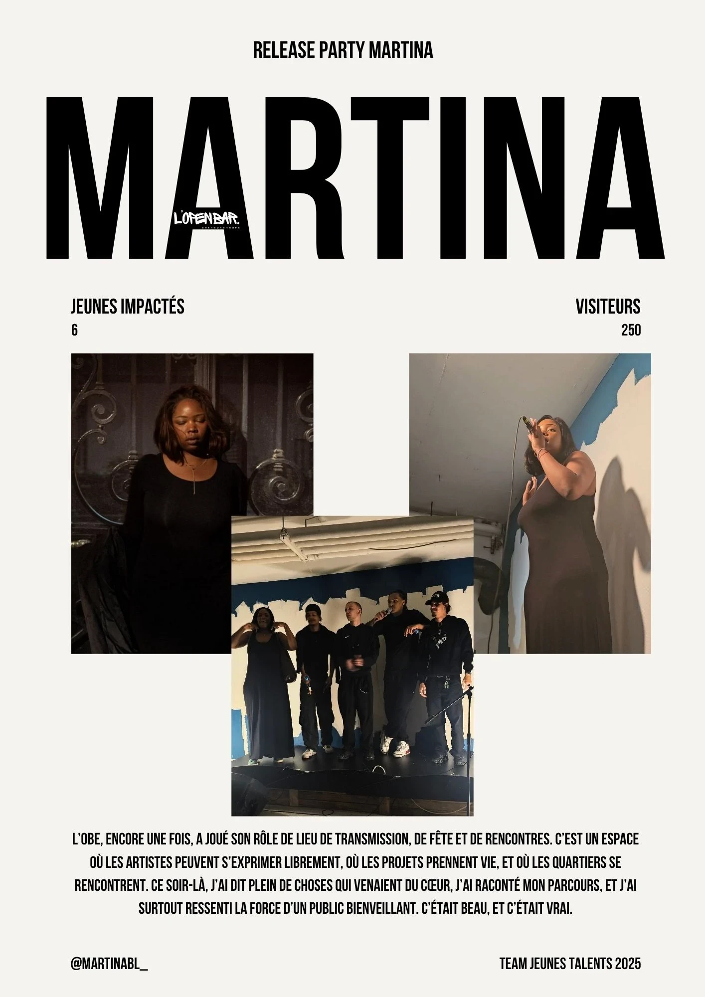 Que vous soyez photographe, chanteur, musicien ou artiste en tout genre et que vous avez -25ans, l'Open Bar Entrepreneurs est votre scène, votre atelier, votre laboratoire d'idées.